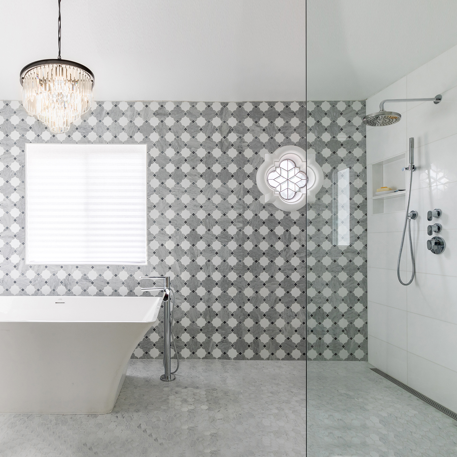 Freestanding bathtubs work best in these spaces, but it’s crucial to pick a shape and size that works with the wet bath’s overall design concept and scale. Hydro Systems has a multitude of sizes that can work in both large and small configurations. For a smaller wet bath, the 48″ Soho freestanding bath or 58″ Alamo freestanding bath have small footprints and outstanding contemporary and transitional aesthetics, respectively, that would complement any wet bath scheme. If there is a luxury of space in a wet bath and a freestanding tub is able to be accommodated, there are several options to create a sanctuary space. The 70″ Denali freestanding bath or the 68″ Tribeca freestanding bath work in both contemporary and transitional designs.