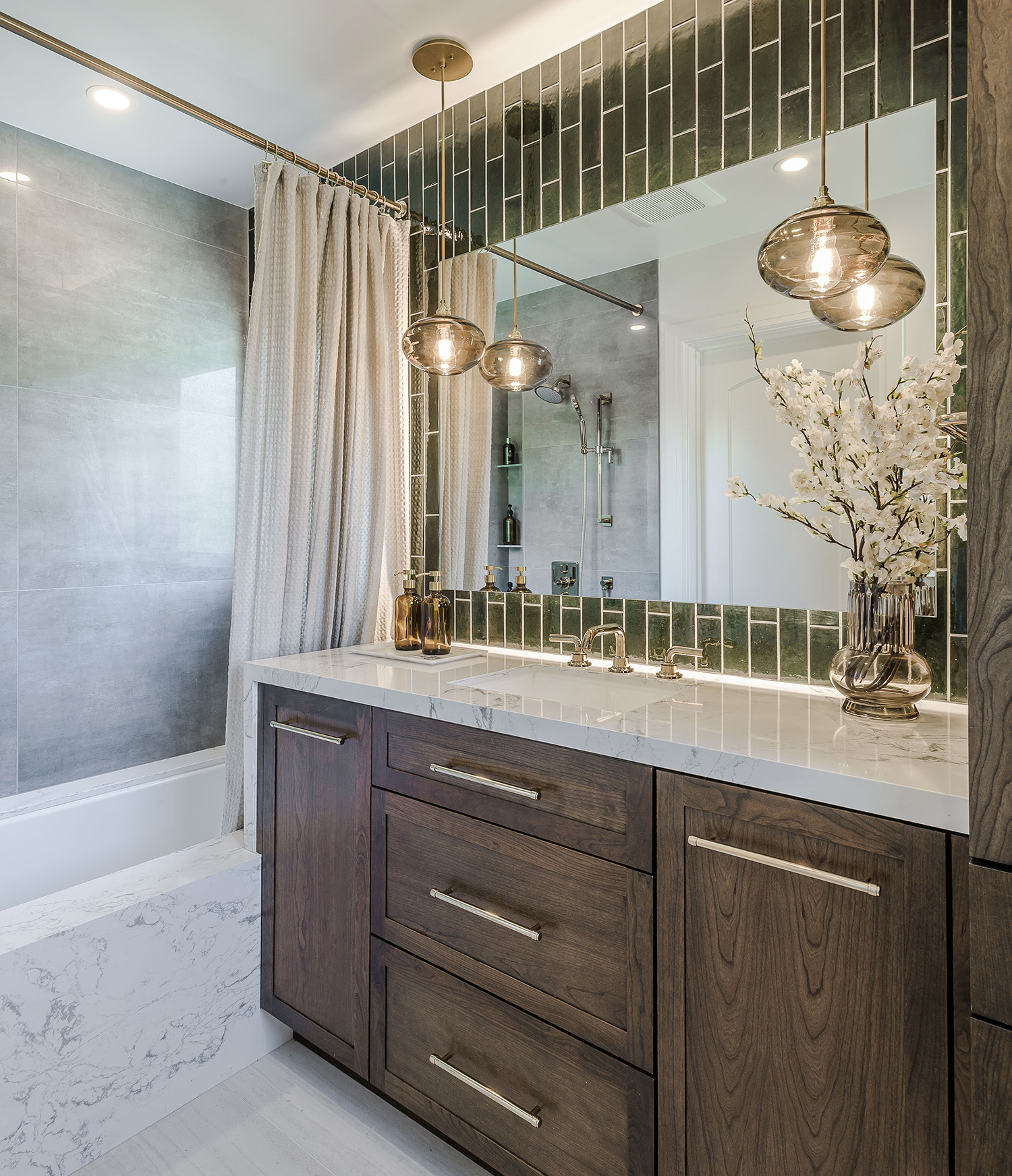 The materials palette—walnut-toned cabinetry, softly veined quartz, glossy vertically stacked wall tile in Emerald green, and warm polished French Gold accents—dipped the space further into the timeless-yet-serene category. “The clients wanted the bathroom to be used for kids and guests, so the aesthetic was sophisticated and chic, not specific to children,” adds Yeh.